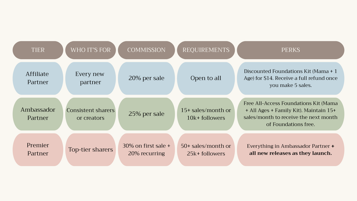 Receive your Foundations Kit (Mama + 1 Age) at a special ambassador rate — or free if you qualify.